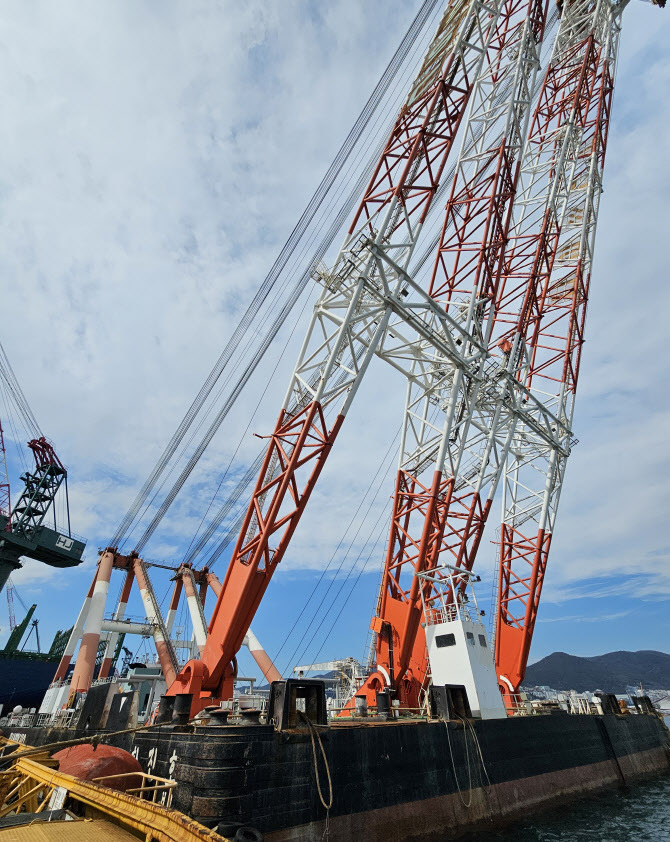 지난 31일 한국해양기자협회 소속 기자들이 찾은 HJ중공업 부산 영도조선소 안벽에 들어서자 거대한 해상 크레인이 위용을 뽐냈다. 이곳엔 대형 조선소의 상징과도 같은 골리앗 크레인은 없다. 대신 붉은색 해상 크레인이 바다를 미끄러지듯 가로지르며 무게 3000톤에 달하는 블록을 들어 올린다.