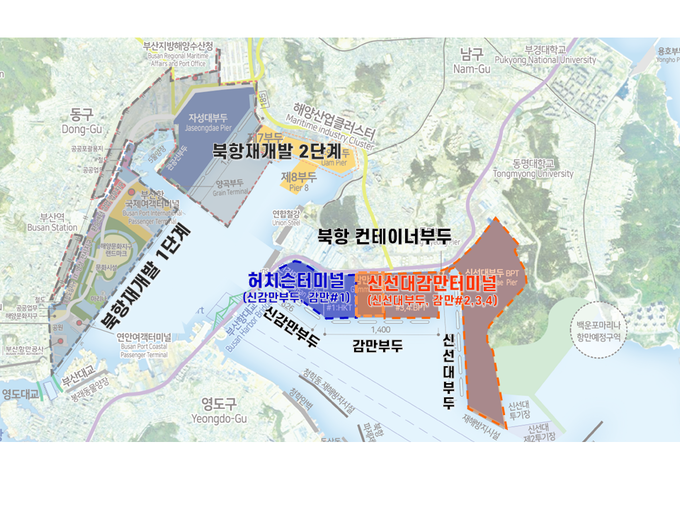 현재 북항에는 세계 6위 글로벌터미널운영사인 한국허치슨터미널(주)과 장금상선 등 국내기업이 투자한 신선대감만터미널(주)이 부산항대교 외측의 신감만, 감만, 신선대 총 3개 부두를 운영 중이다.